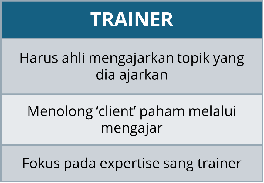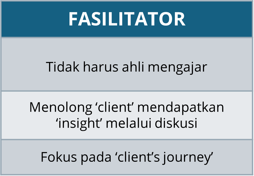 Jadi fokus seorang fasilitator bukan ‘mengajar’, melainkan menjadi rekan berpikir ‘client’ agar mereka dapat mendapatkan ‘insight’ dari apa yang mereka pelajari.